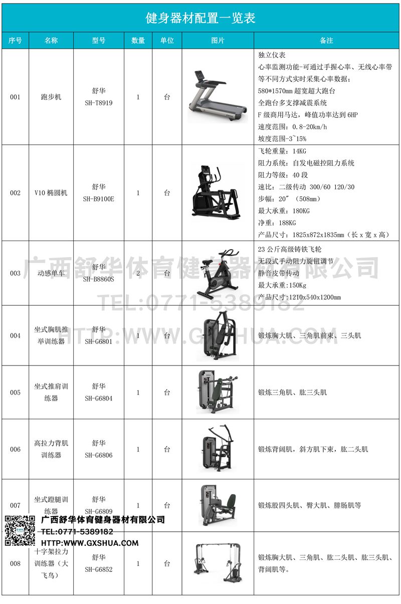 1.好博V9跑步机SH-T8919*4台-580*1570mm超宽超大跑台-跑感舒适,跑台整体安全稳定;全跑台多支撑减震平台,保证跑台超强支撑力,达到180kg支撑,满足专业健身房需求。F级商用马达-超强马达,AC 3.0HP 交流,峰值功率达到6HP,F级商用品质。速度范围达到0.8-20km/h;V9跑步机可实现跑台扬升功能,坡度范围-3~15%,满足客户不同的锻炼需求。