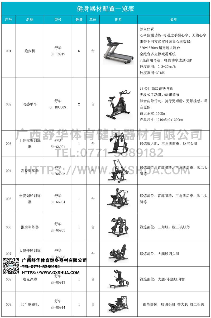 1.好博V9跑步机SH-T8919*6台-580*1570mm超宽超大跑台-跑感舒适,跑台整体安全稳定;全跑台多支撑减震平台,保证跑台超强支撑力,达到180kg支撑,满足专业健身房需求。F级商用马达-超强马达,AC 3.0HP 交流,峰值功率达到6HP,F级商用品质。速度范围达到0.8-20km/h;V9跑步机可实现跑台扬升功能,坡度范围-3~15%,满足客户不同的锻炼需求。
