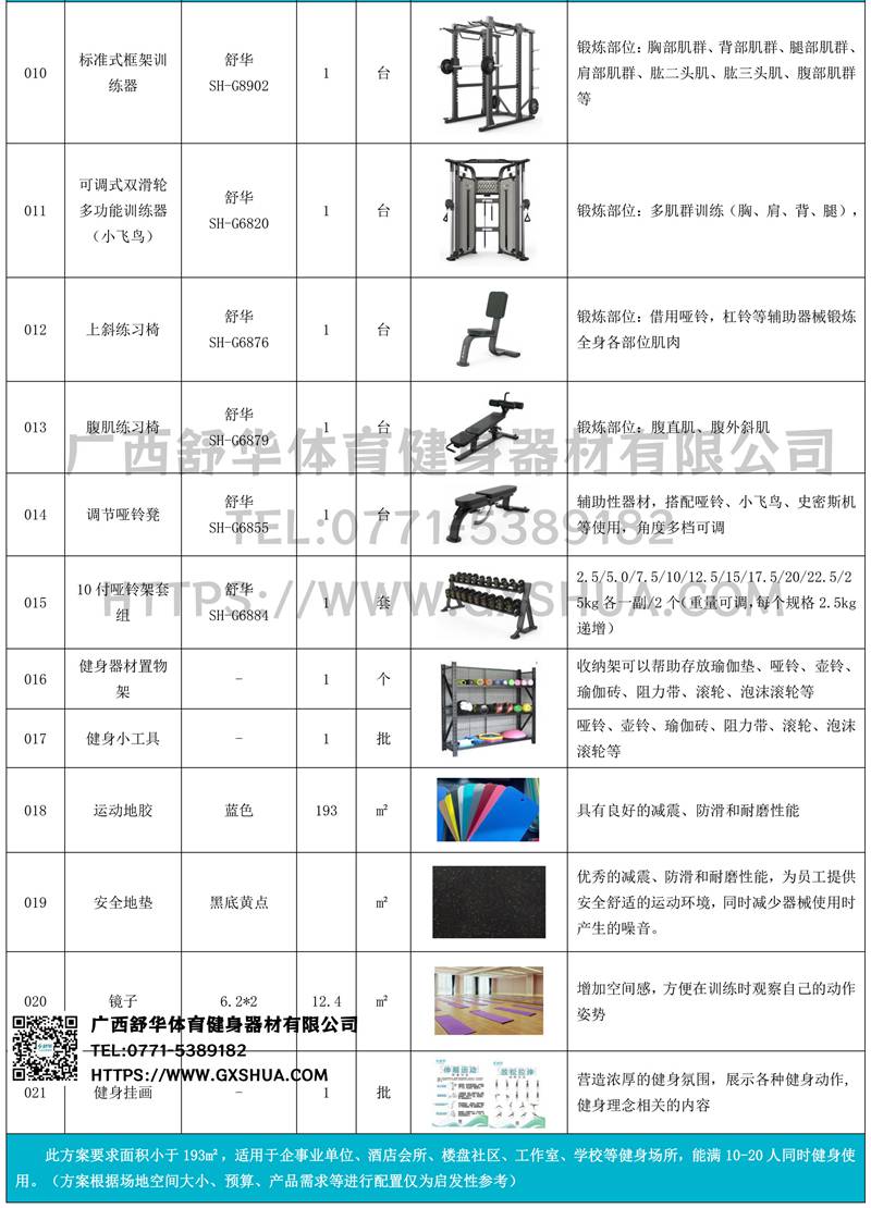 此方案要求面积小于163m²,适用于企事业单位、酒店会所、楼盘社区、工作室、学校等健身场所,能满25-30人同时健身使用。(方案根据场地空间大小、预算、产品需求等进行配置仅为启发性参考)