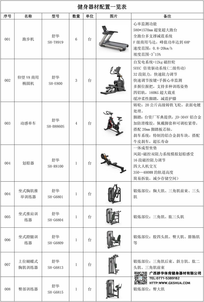 1.好博V9智能跑步机SH-T8919*6台-独立仪表-简洁大气,全新外观设计,健康运动新选择;心率监测功能,可通过手握心率、无线心率带等不同方式实时采集心率数据;580*1570mm超宽超大跑台-跑感舒适,跑台整体安全稳定;全跑台多支撑减震平台,保证跑台超强支撑力,达到180kg支撑,满足专业健身房需求。F级商用马达-超强马达,AC 3.0HP 交流,峰值功率达到6HP,F级商用品质。速度范围达到0.8-20km/h;V9跑步机可实现跑台扬升功能,坡度范围-3~15%,满足客户不同的锻炼需求。