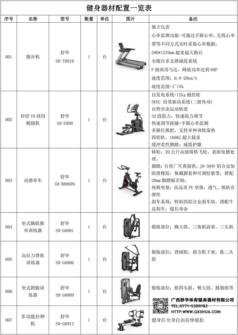 1.好博V9智能跑步机SH-T8919*3台-独立仪表-简洁大气,全新外观设计,健康运动新选择;心率监测功能,可通过手握心率、无线心率带等不同方式实时采集心率数据;580*1570mm超宽超大跑台-跑感舒适,跑台整体安全稳定;全跑台多支撑减震平台,保证跑台超强支撑力,达到180kg支撑,满足专业健身房需求。F级商用马达-超强马达,AC 3.0HP 交流,峰值功率达到6HP,F级商用品质。速度范围达到0.8-20km/h;V9跑步机可实现跑台扬升功能,坡度范围-3~15%,满足客户不同的锻炼需求。