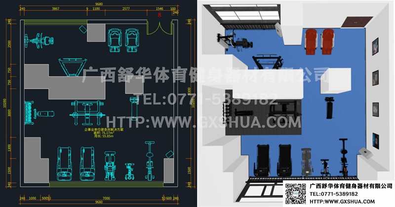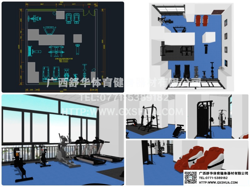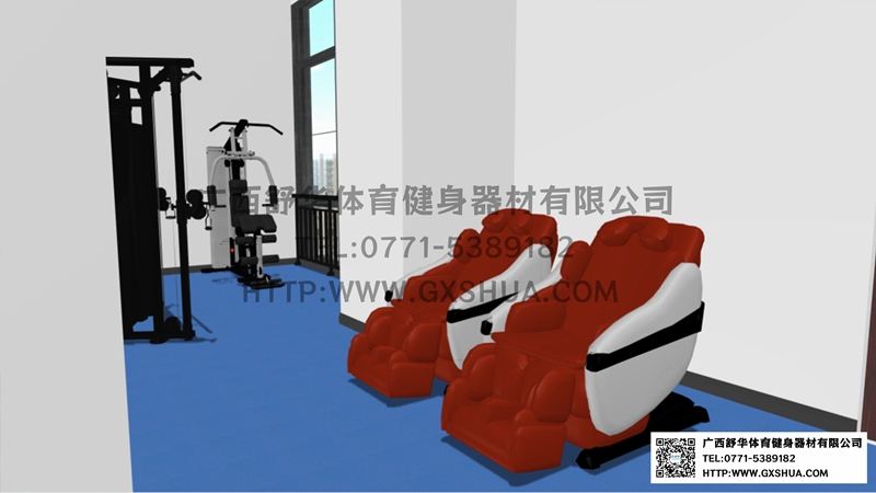 由于企业单位健身房的不规则性,根据场地、职工需求、整体预算,有氧器材区域配置好博跑步机2台,椭圆机、动感单车、划船器各1台,满足职工的日常有氧训练需求,有效地提升心肺功能;力量器械配置单人站综合训练器、小飞鸟,满足使用者全身锻炼的需求;自由力量区域配置史密斯机、哑铃套组、腹肌板满足多样化训练需求,促使健身训练更丰富,休闲区配置按摩椅,可以促进血液循环,让员工使用按摩椅放松身心,可以能够有效缓解工作压力。