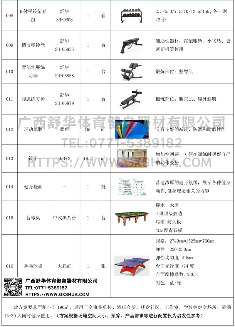 此方案要求面积小于190m²,适用于企事业单位、酒店会所、楼盘社区、工作室、学校等健身场所,能满15-30人同时健身使用。(方案根据场地空间大小、预算、产品需求等进行配置仅为启发性参考)