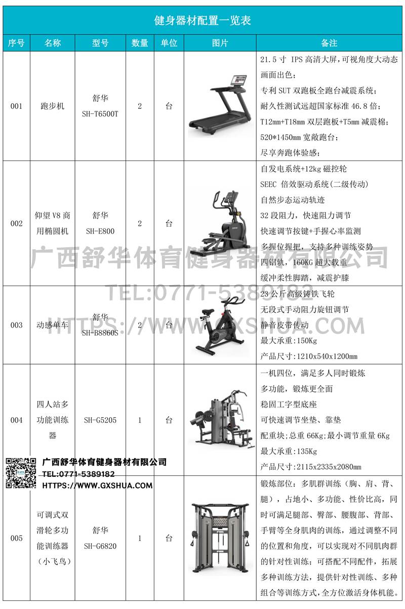 1.好博X5 Pro跑步机SH-T6500T*2台-采用高性能电机,提供稳定动力,支持长时间高强度运行,适合长时间有氧训练,跑台宽敞,提供舒适跑步空间,减少运动中的束缚感,适合不同体型用户。配备先进减震系统,有效缓解跑步对关节的冲击,降低运动损伤风险,内置智能控制系统,支持多种预设程序和个性化训练计划,用户可根据需求调整速度和坡度,满足多样化训练。
